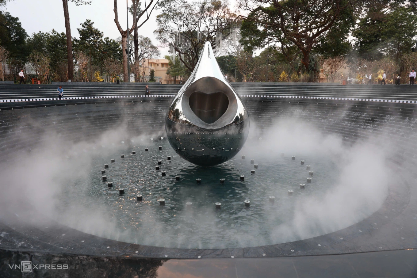 Giữa quảng trường là tượng đài “Giọt nước” cao 6 m, chu vi 13 m, chế tác từ inox gương. Bên trong là hình ảnh trái tim - chi tiết được VnExpress nhấn mạnh như biểu tượng của sự tri ân và tình yêu thương.