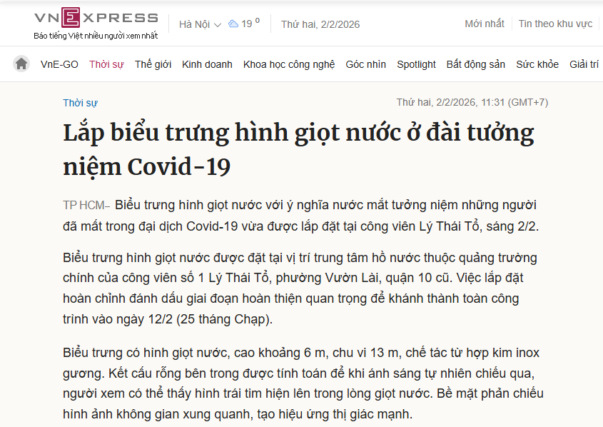 Link bài báo: Lắp biểu trưng hình giọt nước ở đài tưởng niệm Covid-19 - Báo VnExpress